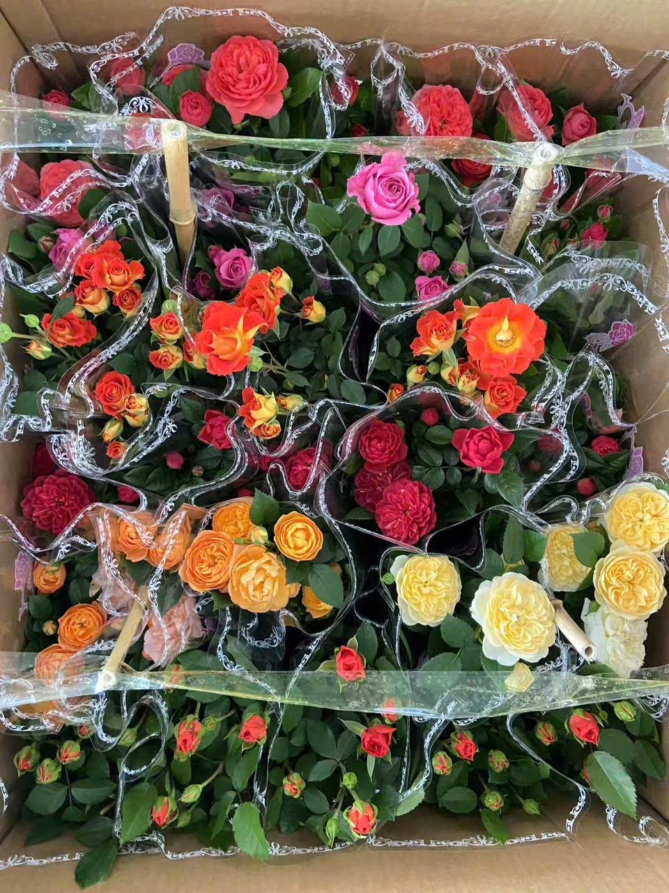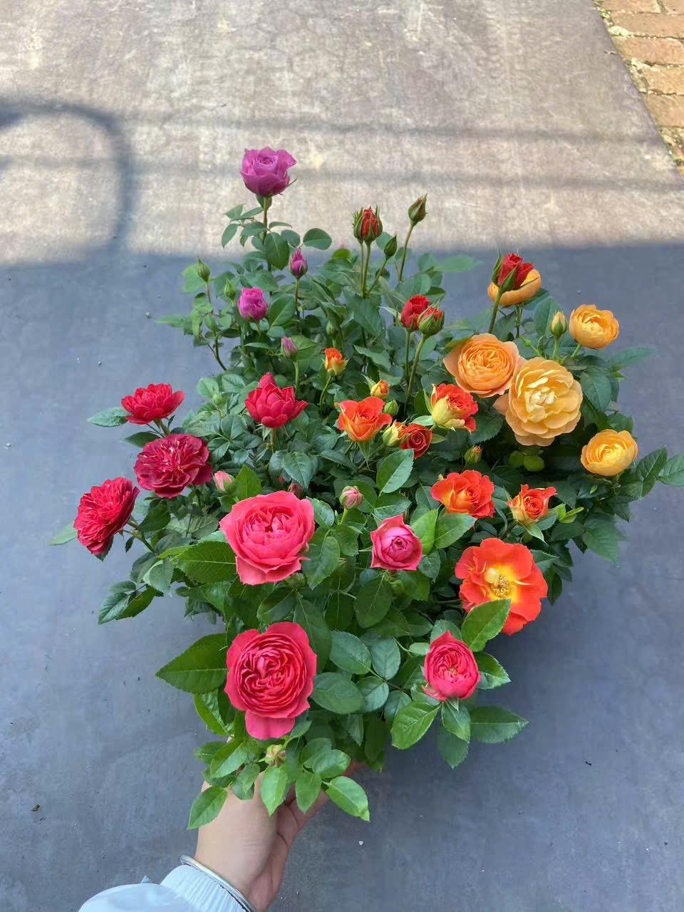 A vibrant pot of roses in a variety of colors: deep red, bright pink, fiery orange, and warm yellow – symbolizing love, happiness, and hope. Each bloom carries a message of affection for the recipient and adds an elegant decorative touch to any living space.